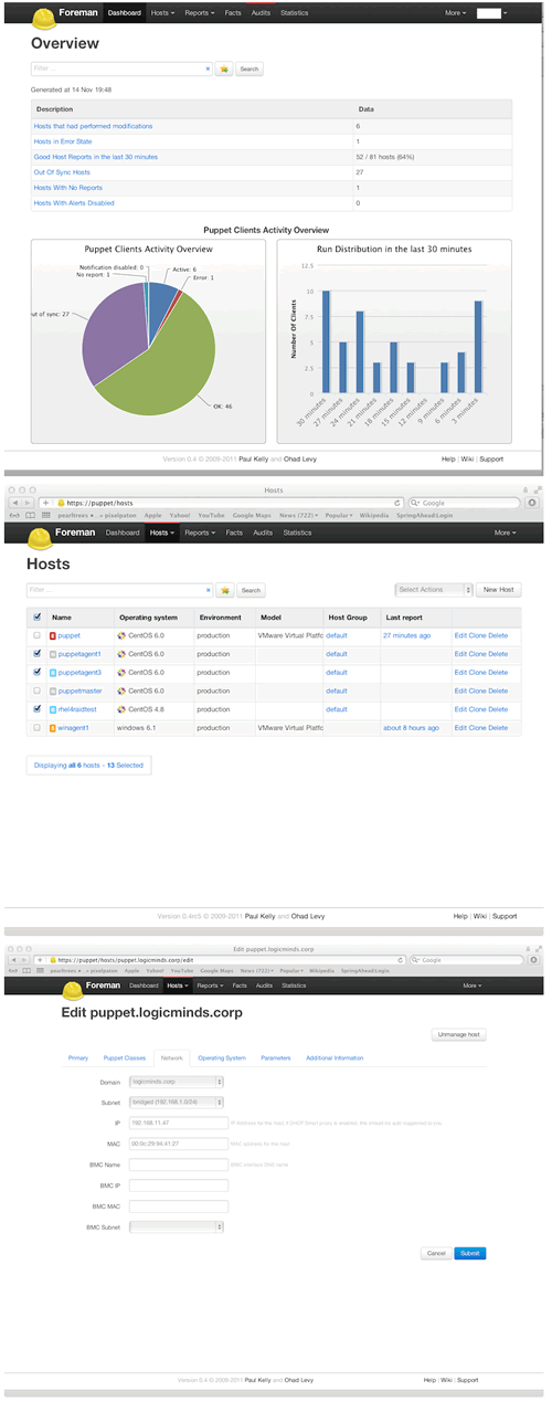 Foreman能够管理大规模(当然也包括小规模)的,企业级的的网络,可能有很多域,子网和很多puppet master节点.Foreman也可以实现配置版本的回溯.