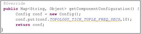 若希望某个bolt每隔一段时间做一些操作,那么可以将bolt继承BaseBasicBolt/BaseRichBolt,并重写getComponentConfiguration()方法。在方法中设置Config.TOPOLOGY_TICK_TUPLE_FREQ_SECS的值,单位是秒。