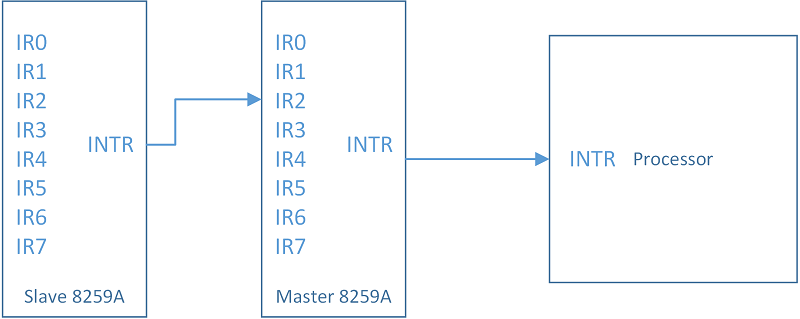 每个8259A PIC的IR口都连接着一条IRQ线。主片的IR0到IR7对应着IRQ0到IRQ7线,但是IR2连接着从片的INTR pin。从片的IR0到IR7对应着IRQ8到IRQ15线。由于从片连接到主片的IR2上,所以从片的IR1同时连接到IRQ2和IRQ9。
