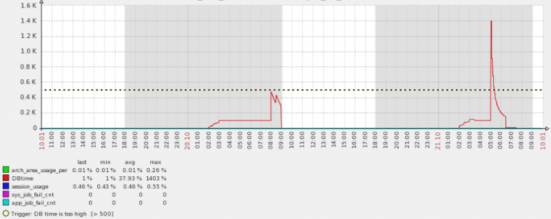 下面的图是两天内的DB time情况,通过下面的图可以看到DB time前一天是到了临界阀值,但是还没有越界,所以没有报警,而昨天却又很大的抖动。