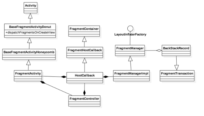 3.HostCallbacks:HostCallBacks是FragmentHostCallback的子类,主要实现了像 onAttachFragment 、 onStartActivityFromFragment 、 onFindViewById 等回调方法,从UML图中可以看出它持有Activity引用,是在如上提到的FragmentActivity创建FragmentController时传入。