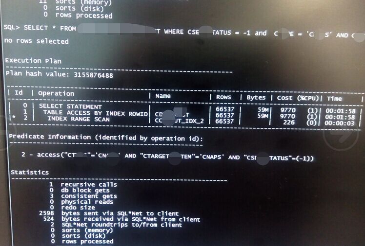 此时应该是统计信息出现问题,于是进行收集统计信息。 exec dbms_stats.gather_table_stats(ownname => 'XX ', tabname => 'XXX' , estimate_percent =>dbms_stats.auto_sample_size, , method_opt => 'for all indexed columns size auto' , cascade => true);