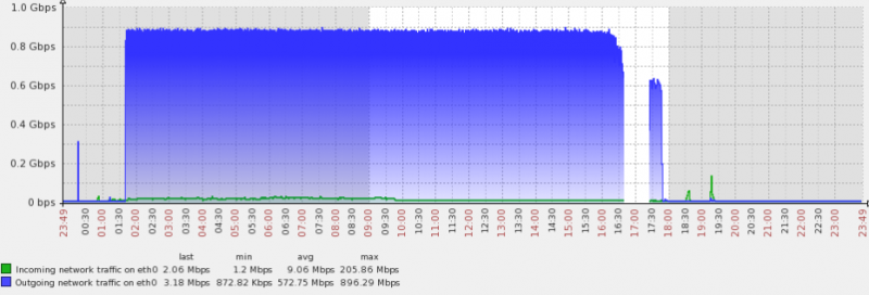 等到晚上6点多的时候,发现另外一台备库的文件复制速度开始大幅度提升,查看网卡的流量情况如下。