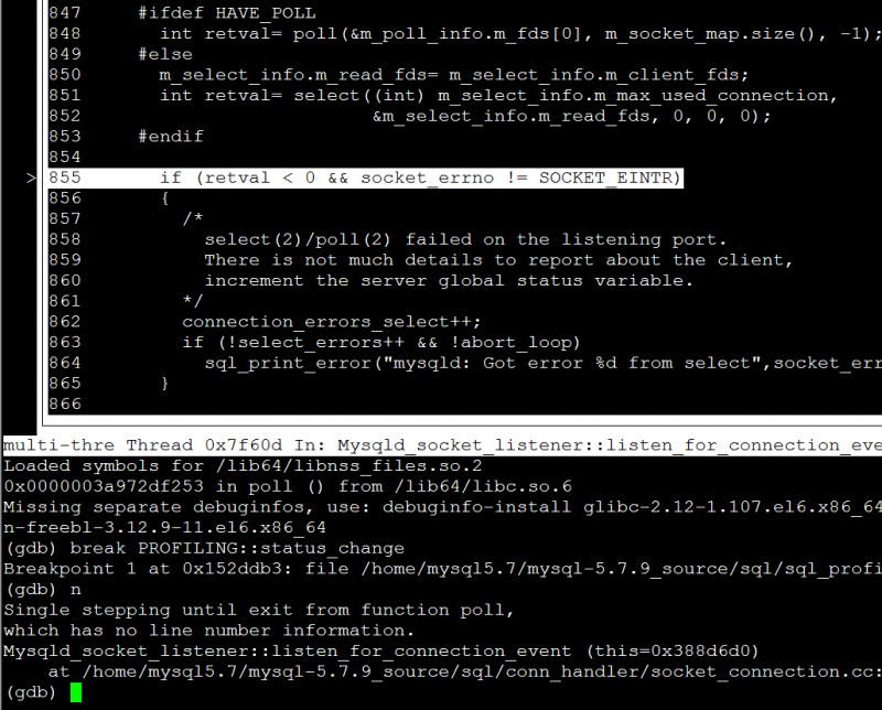开启另外一个MySQL终端.执行查询,然后进入gdb的断点.