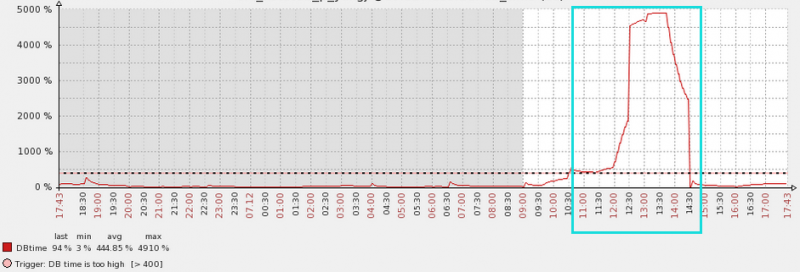 可以看到在蓝色的框中是问题发生时间段的DB time情况,其实后面直接飙到了5000%这个效果是很恐怖的。