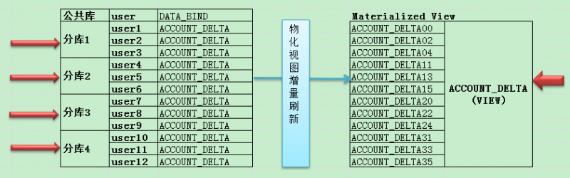目前的这个库是一个统计库,库里的数据是从账号库中分库分表的12个用户中得来,就如同左边所示,是放在了4个分库,12个用户中,表名都是account_delta