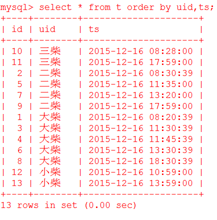 - insert into t(uid,ts) values('三柴','2015-12-16 08:28:00');