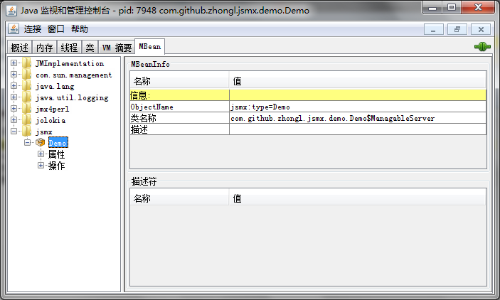运行之后, 你可以通过 jconsole 查看到已经发布的MBean.