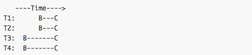 事务T1、T2(start transaction)开始事务,落后于事务T3、T4的(start transaction)开始时间,但是这一组事务都在C(commit)时间点提交事务,所以这一组事务(T1、T2、T3、T4)将在master机器上进行Binary Log group Commit,然后该二进制日志推送到slave机器上时可以并发执行这一组被标记的事务。