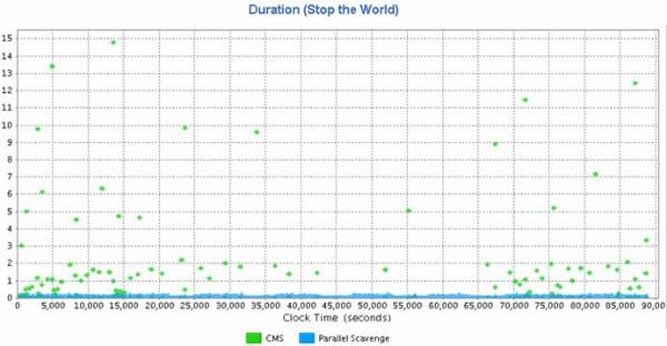 上图是HPJMeter自动分析结果后提供的系统GC随着JVM运行的耗时图。 X-轴 是JVM从启动后的运行时间轴, Y-轴 是每次GC的响应时间。其中绿色的是Full GC使用的CMS垃圾回收的耗时,蓝色的是Minor GC使用的Parallel Scavenge垃圾回收的耗时。