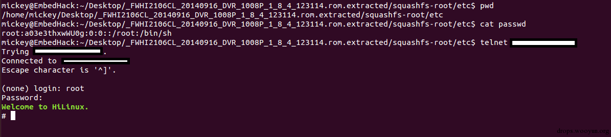 另外经过破解passwd,发现root的默认密码是”juantech”,可以通过telnet登录直接获取cmdshell,如图1: