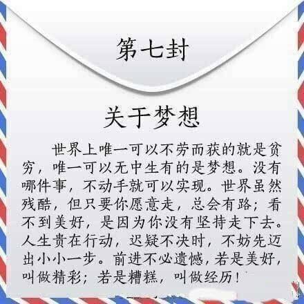 世界上唯一可以不劳而获的是贫穷,唯一可以无中生有的是梦想。九封信,愿每一封都能对你有所启发。