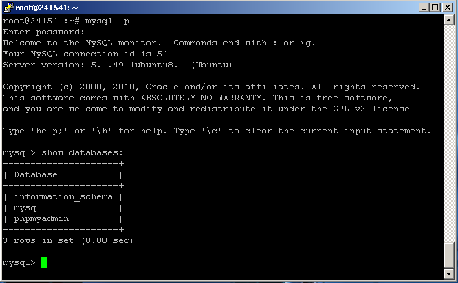 对于mysql数据库维护可以使用前面安装的 phpmyadmin 进行维护,或直接在 putty 中输入 mysql -p 进行管理如图所示:
