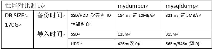 可以发现,在备份时间上,mydumper性能比mysqldump好将近1倍,通过分析不难发现,两者性能的差距主要跟备份实例的IO性能以及mydumper开启的线程数有关系,如果外部实例的IO性能很差,那么可能mysqldump单线程就能够将IO吃满,那改为使用mydumper也无法带来性能提升,但 如果实例的IO性能较好,通过增加备份线程数(测试所用为2线程),就可能带来成倍的性能提升 。导入时间分别使用与mydumper配合使用的myloader多线程sql导入工具以及mysqldump对应的source命令得到。相应的,在IO性能较好的SSD上,myloader的多线程优势体现明显,比source的单线程执行时间上节省将近2倍(测试所用为4线程)。不过在HDD上,由于其本身性能原因,myloader带来的效益变小。