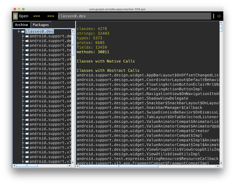 ClassyShark 可以查看 apk 中的 dex 文件,这样可以看看编译后的 dex 中都包含哪些类,同时该工具还显示了每个包里面有多少个函数。
