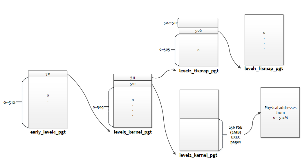#define NEXT_PAGE(name) / .balign PAGE_SIZE; / GLOBAL(name) /* Automate the creation of 1 to 1 mapping pmd entries */ #define PMDS(START, PERM, COUNT) / i = 0 ; / .rept (COUNT) ; / .quad (START) + (i << PMD_SHIFT) + (PERM) ; / i = i + 1 ; / .endr 我们就可以很轻易地画出下面这张图: