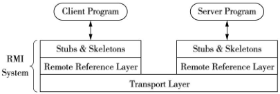 RMI 构建三个抽象层, 高层覆盖低层, 分别负责Socket通信, 参数和结果的序列化和反序列化等工作。存根( Stub) 和骨架( Skeleton) 合在一起形成了 RMI 构架协议。下面的引用层被用来寻找各自的通信伙伴, 在这一层还有一个提供名字服务的部分, 称为注册表( registry) 。最下一层是传输层, 是依赖于 TCP/IP 协议实现客户机与服务器的互联。