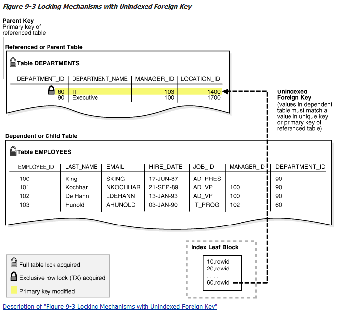Oracle Database maximizes the concurrency control of parent keys in relation to dependent foreign keys. Locking behavior depends on whether foreign key columns are indexed. If foreign keys are not indexed, then the child table will probably be locked more frequently, deadlocks will occur, and concurrency will be decreased. For this reason foreign keys should almost always be indexed. The only exception is when the matching unique or primary key is never updated or deleted.