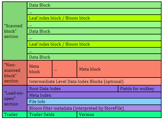Load-on-open-section:这部分数据在HBase的region server启动时,需要加载到内存中。包括FileInfo、Bloom filter block、data block index和meta block index。