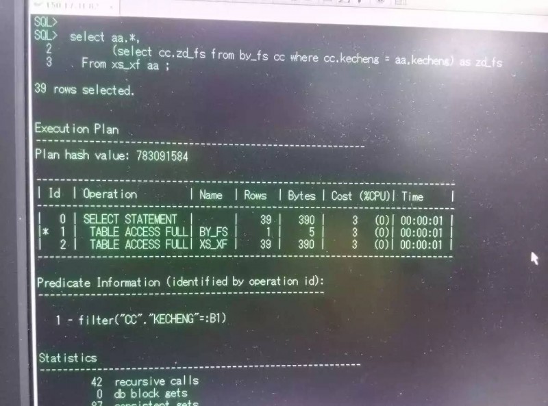 可以看到是可以复现这个朋友的问题的。这个时候从执行计划来入手,看到对于表XS_XF走了全表扫描,对于其中的数据在表BY_FS中通过全表扫描进行匹配。