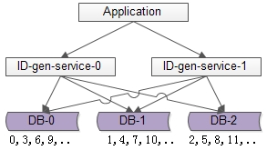 如上图所述,由1个写库变成3个写库,每个写库设置不同的auto_increment初始值,以及相同的增长步长,以保证每个数据库生成的ID是不同的(上图中库0生成0,3,6,9…,库1生成1,4,7,10,库2生成2,5,8,11…) 改进后的架构保证了可用性,但缺点是: