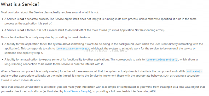 上面的官方文档说的很清楚了,Service不是一个线程,是主程序的一部分,需要调用Context.startService()来启动它,如果退出应用时,Service进程并没有结束,它仍然在后台行。比如我们在执行下载应用的时候,有可能去看新闻,正是有了Service,我们可以切换到新闻客户端来阅读新闻,而下载任务在后台被Service所执行。