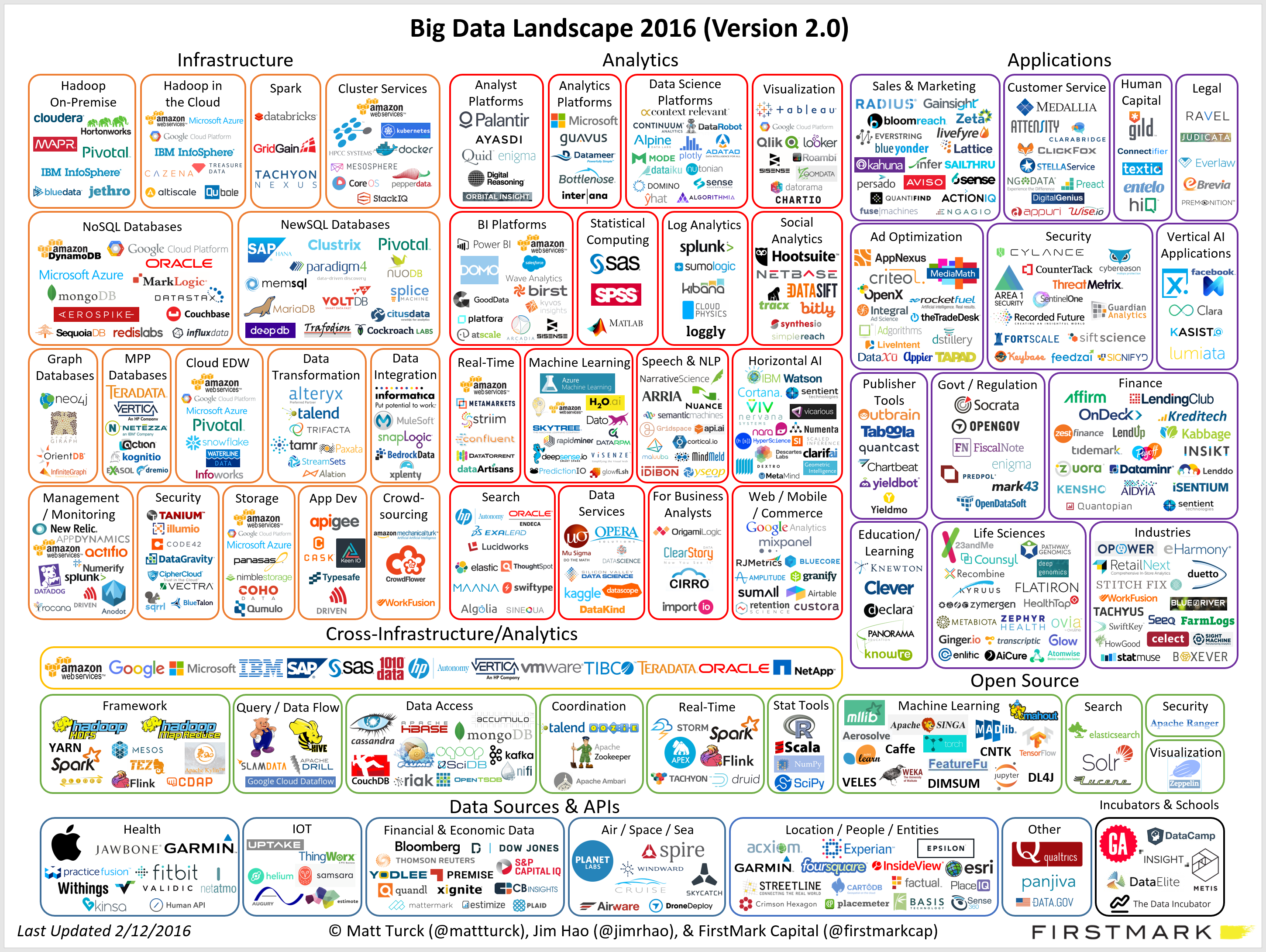 随着该领域的创业活动持续进行以及资金的不断流入,加上适度的少量退出,以及越来越活跃的技术巨头(尤其是 Amazon、Google、IBM),使得这个领域的公司日益增多,最后汇成了这幅 2016 版的大数据版图。