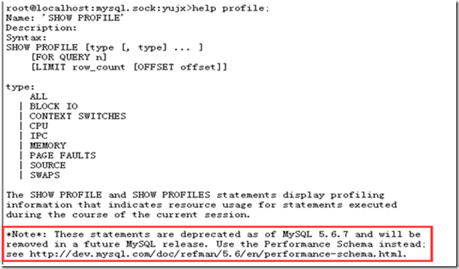 SHOW PROFILE可以用来MySQL执行语句时候所使用的资源(诸如IO,上下文切换,CPU,Memory等等),但是从MySQL 5.6.7开始此特性将被移除,而使用Performance Schema代替,如下: