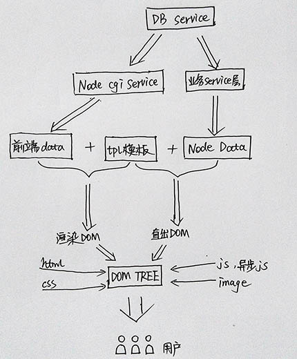 首先说下目前比较主流的web前后端分离方案:这种方案将web站点分为前端和后台,前端通过拉取后台数据的到页面再通过js模板渲染到页面上。几个主要问题,一是页面显示需要等后台请求(cgi等)返回来才能渲染,二是seo怎么办,同时也承受开发联调效率的考研。