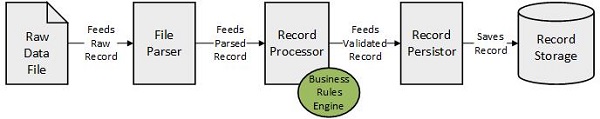 这些具体步骤可以分解为多个流程或是合并为一个流程,不过我们现在只需专注于Record Processor这个模块即可。该模块将对当前记录进行一系列步骤操作,在将其提交给持久化的存储引擎(例如数据库表)之前对其进行校验,或是对数据进行操作。具体来说,我们最感兴趣的是那些将以特定的业务规则处理这部分数据的步骤。举例来说,我们的业务只会保存某种特定类型的产品记录,因此如果某个产品的类型为“Death Star”,就直接拒绝该记录。