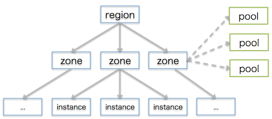 Ceph对象网关(Ceph Object Gateway,radosgw) 提供了S3和Swift的API,同时也支持S3的一些概念。 辖区(region) 表明了一个地理位置,比如us。在这个辖区里可以有多个 域(zone) ,比如east和west。一个域里可以有多个实例,一个实例可以有多个 节点(node) 。同时,配置一个域需要一系列的 存储池(pool) 。如下图: