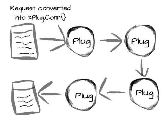 请求首先被转换成 %Plug.Conn{} 结构, 并传递个链条中的第一个 Plug , 第一个 Plug 处理(修改,增加,删除)完成后, 传递给后续的 Plug