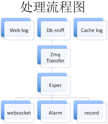 事件处理的流程图很简单,通过Weblog将前端过来的用户请求日志抽取过来,数据库SQL查询的请求也给取过来。比如说Memcache等等,在程序这边来生成的一些事件。中间通过一个传输层交给Esper统计分析,根据写好的规则统计结果,结果可以通过用Websocket推到前端来看,也可以到终端上用命令行来看,这对运维比较好,还可以对一些结果做报警,或者把这些结果记录下来,供回溯查看。
