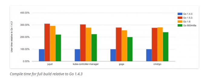 在编译时间方面,自从由C转向Go以来,Go编译器就饱受较差的性能所困扰。这个问题已经有了很多的 讨论 ,在面向Go 1.7的版本中,最近的工作已经完成,它致力于减少编译器所使用的内存量并且在连接时间方面也有所提升。相对于Go 1.5.3,这能够将总的编译时间降低大约20-30%,如下图所示: