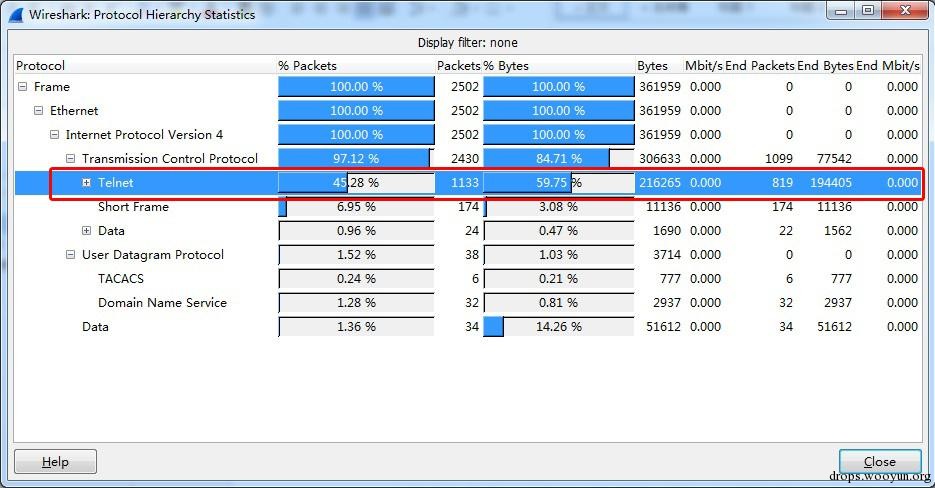 在对客户某服务器区域进行安全监测时发现某服务器通信流量存在大量Telnet协议。截取一段数据,进行协议统计: