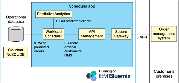 - 客户的订单管理系统 (OMS) 被公开为一个公共 API。这是通过 Bluemix 中的 API Management 服务 完成的。调度程序会调用该服务来创建订单(利用客户的内部部署 OMS 上预测的数量)。