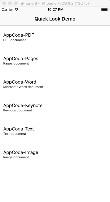 presentViewController(quickLookController, animated: true, completion: nil) 如果你现在就运行demo并点击任意一行,你就能发现对应的文档在Quick Look Preview Controller中被打开了。