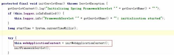 public final void init() throws ServletException { if (logger.isDebugEnabled()) { logger.debug("Initializing servlet '" + getServletName() + "'"); } // Set bean properties from init parameters. try { PropertyValues pvs = new ServletConfigPropertyValues(getServletConfig(), this.requiredProperties); BeanWrapper bw = PropertyAccessorFactory.forBeanPropertyAccess(this); ResourceLoader resourceLoader = new ServletContextResourceLoader(getServletContext()); bw.registerCustomEditor(Resource.class, new ResourceEditor(resourceLoader)); initBeanWrapper(bw); bw.setPropertyValues(pvs, true); } catch (BeansException ex) { logger.error("Failed to set bean properties on servlet '" + getServletName() + "'", ex); throw ex; } // Let subclasses do whatever initialization they like. initServletBean(); if (logger.isDebugEnabled()) { logger.debug("Servlet '" + getServletName() + "' configured successfully"); } } 注意代码: initServletBean(); 其余的都和加载bean关系并不是特别大,跟踪进去会发I发现这个方法是在类:org.springframework.web.servlet. FrameworkServlet 类中(是 DispatcherServlet 的父类、 HttpServletBean 的子类),内部通过调用 initWebApplicationContext ()来初始化一个 WebApplicationContext ,源码片段(篇幅所限,不拷贝所有源码,仅仅截取片段)