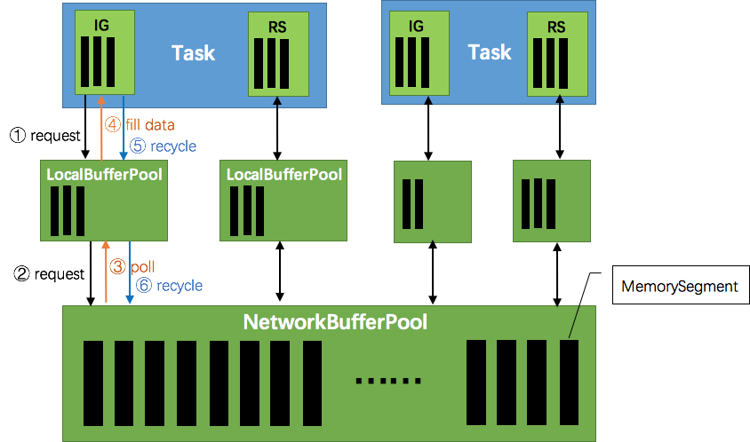 当一个内存块被消费完成之后(在输入端是指内存块中的字节被反序列化成对象了,在输出端是指内存块中的字节写入到 Netty Channel 了),会调用 Buffer.recycle() 方法,会将内存块还给 LocalBufferPool (上图中的⑤)。如果LocalBufferPool中当前申请的数量超过了池子容量(由于上文提到的动态容量,由于新注册的 Task 导致该池子容量变小),则LocalBufferPool会将该内存块回收给 NetworkBufferPool(上图中的⑥)。如果没超过池子容量,则会继续留在池子中,减少反复申请的开销。