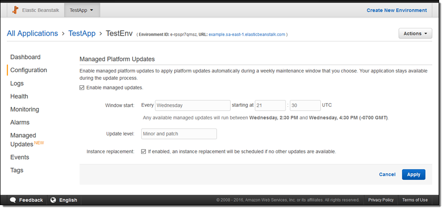 2016年4月19日,Amazon 宣布 更新其Elastic Beanstalk服务。在这次更新中,Amazon为客户提供了自动安装平台更新的功能。