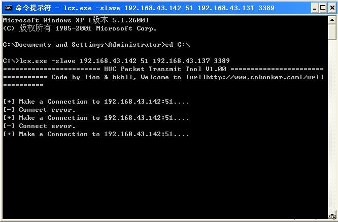 例如: lcx.exe –slave 192.168.43.142 51 192.168.43.137 3389