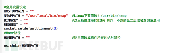 在使用该插件之前需要修改三个全局变量,分别是NMAPPATH,BINGKEY以及HOMEPATH,其他的全局变量不需要改