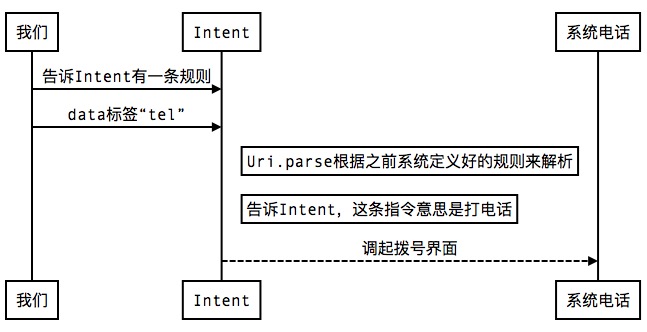 <activity android:name=".TestActivity"> <intent-filter> <action android:name="com.scott.intent.action.TARGET"/> <category android:name="android.intent.category.DEFAULT"/> <data android:scheme="scott" android:host="com.scott.intent.data" android:port="9090" android:path="/test"/> </intent-filter> </activity> public void gotoTestActivity(View view) { Intent intent = new Intent("com.scott.intent.action.TARGET"); intent.setData(Uri.parse("scott://com.scott.intent.data:9090/test")); startActivity(intent); } 我们用Intent调系统打电话为例: