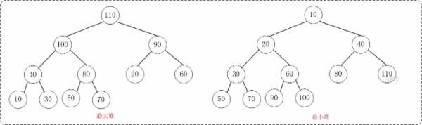 最大堆:父结点的键值总是大于或等于任何一个子节点的键值;最小堆:父结点的键值总是小于或等于任何一个子节点的键值。示意图如下: