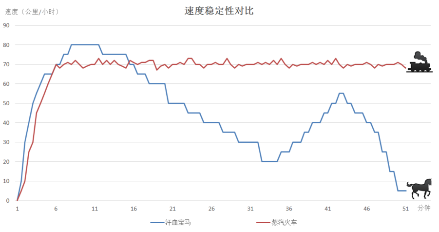 上图的横轴表示测试时间,纵轴表示火车和马的速度,可以看到,马的加速和最高速度均好于火车。但是由于体力原因,15分钟后,马就很难维持最高速度,只能稍作休息再加速,直至体力耗尽;而火车全程达到最高速度就基本不会变了。所以结论很明显,火车的速度稳定性优于汗血宝马。