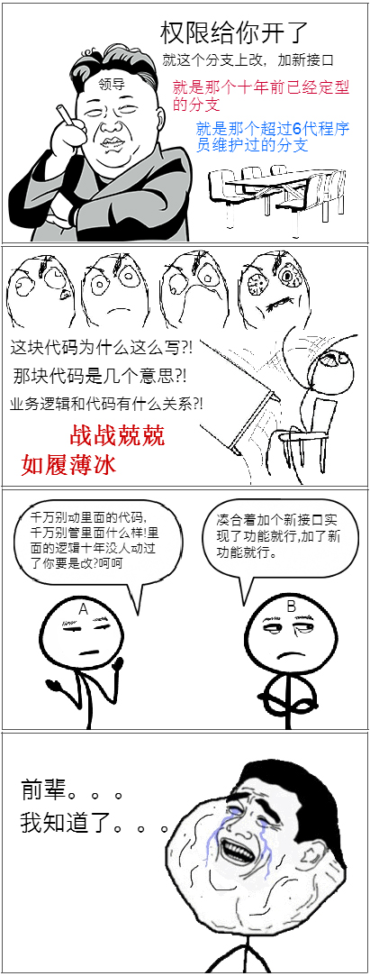 尽管这样,我们对老代码仍是 恨之 厌之 烦之 远之 却不可弃之 ,它已经老而成精有了生命。