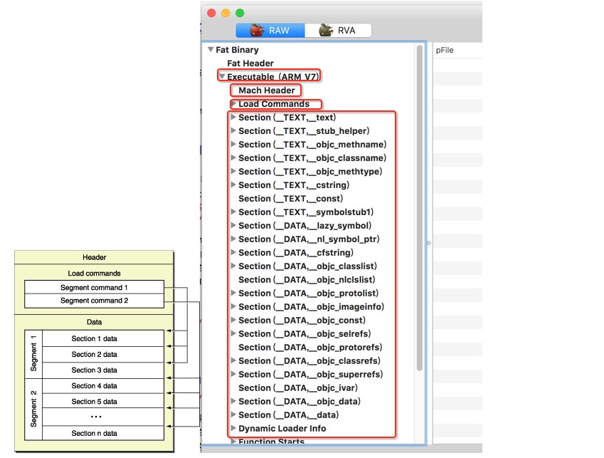 上面第一个图是苹果给出的mach-O格式的示意图,而第二个图是我们使用machOView来分析某个可执行文件中的armv7的格式。可以看出他们两者的关系是对应的。