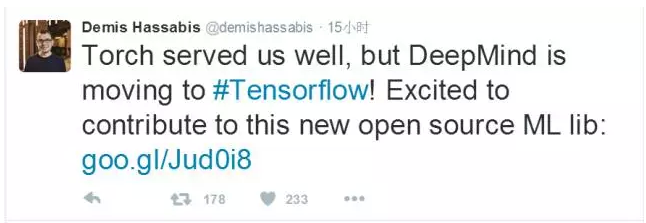 DeepMind 创始人昨日推文:「Torch 上的服务非常好,但 DeepMind 要迁移到 Tensorflow 了。我对能够为这个新的开源机器学习资料库做出贡献感到兴奋。」