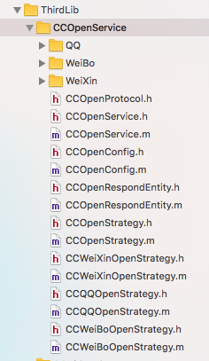 //微信登录 CCOpenService *wxService = [CCOpenService getOpenServiceWithName:CCOpenServiceNameWeiXin]; [wxService requestOpenAccount:^(CCOpenRespondEntity *respond) { if (respond == nil) { UIAlertView *alert = [[UIAlertView alloc] initWithTitle:@"温馨提示" message:@"^_^亲,您木有安装微信哟~ " delegate:nil cancelButtonTitle:@"知道啦" otherButtonTitles:nil]; [alert show]; return; } NSLog(@"Respond data is %@",respond.data); }]; WeiXin,QQ,WeiBo目录下的SDK需要手动导入,另外第三方平台的SDK可能需要手动导入一些类库,具体的先参考具体平台的官方说明,有空更新上. 由于本人工作忙,所以很多功能还没时间写上.目前已经写好了整体框架,有兴趣的同学可当作自己学习锻炼机会,参考我的源码设计模式,将新增的功能PullRrequest给我,谢谢.