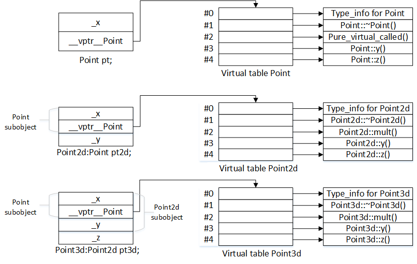 C++类通过虚指针vptr和虚函数表机制实现多态。假设Point2d派生自Point,Point3d派生自Point2d,下图是带有虚函数表的单一继承情况下,类Point、Point2d、Point3d的内存布局: